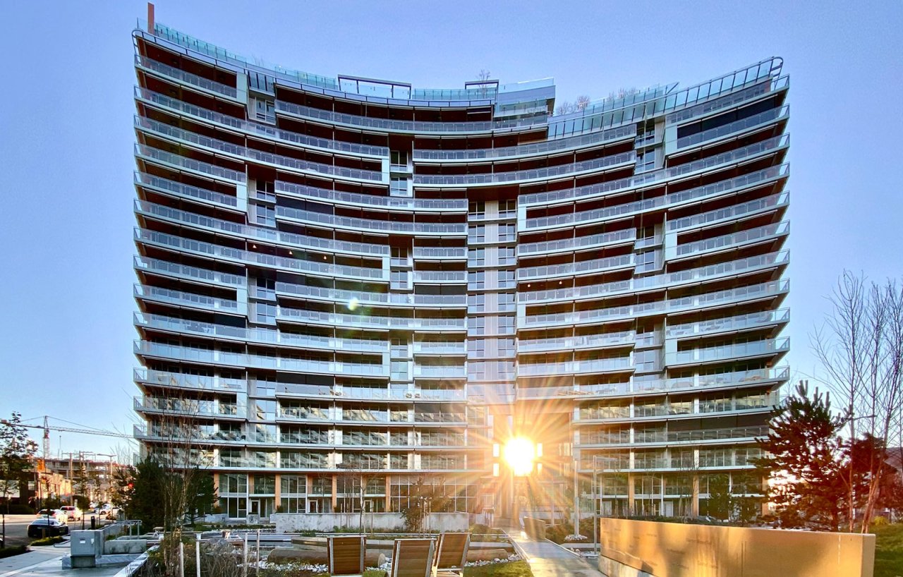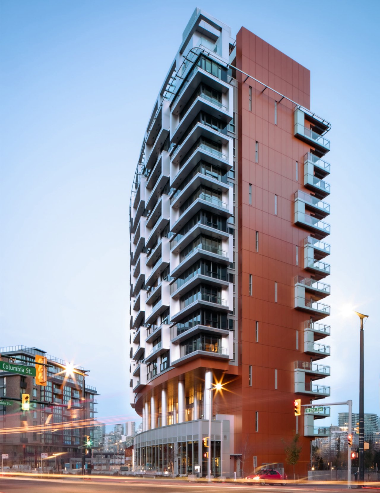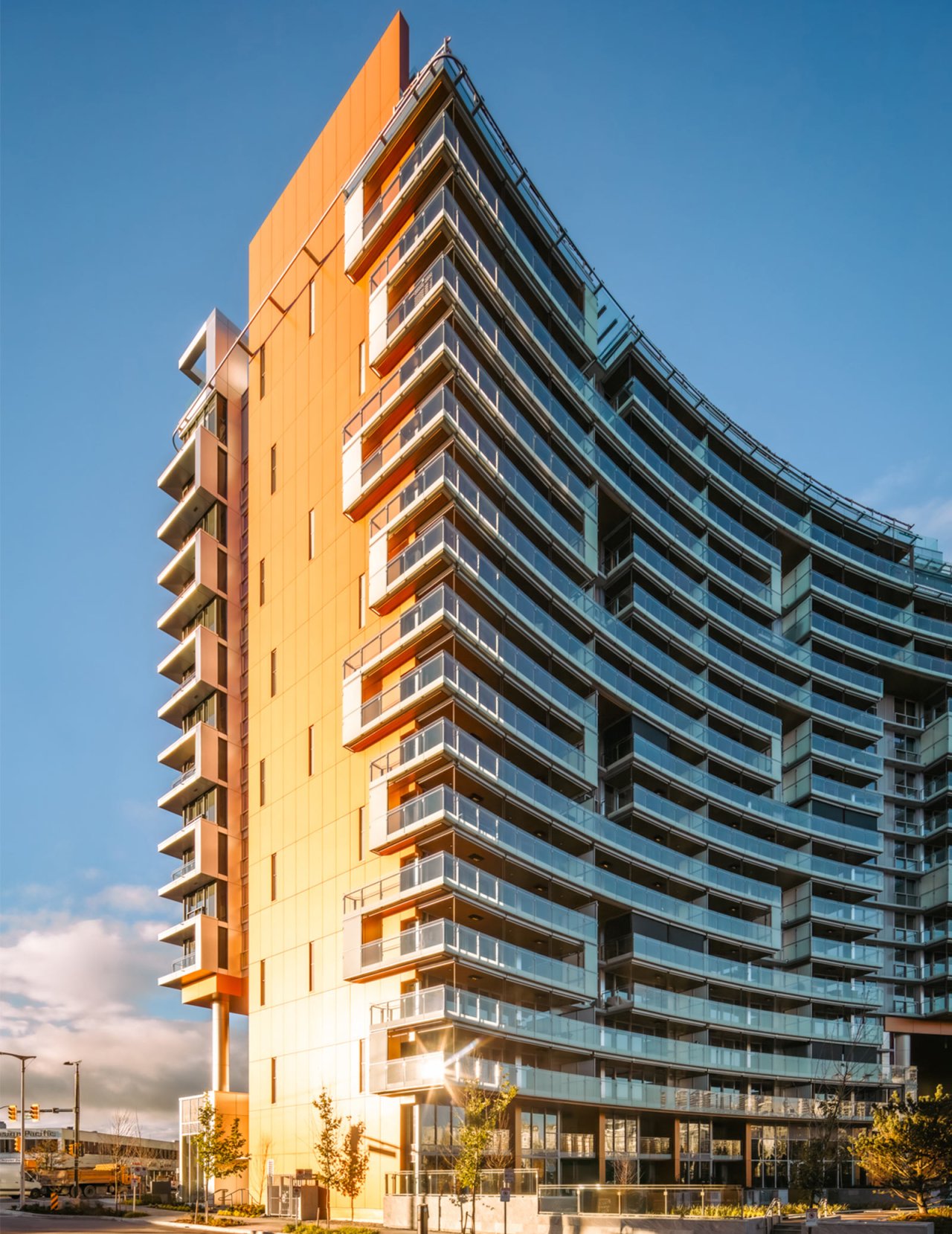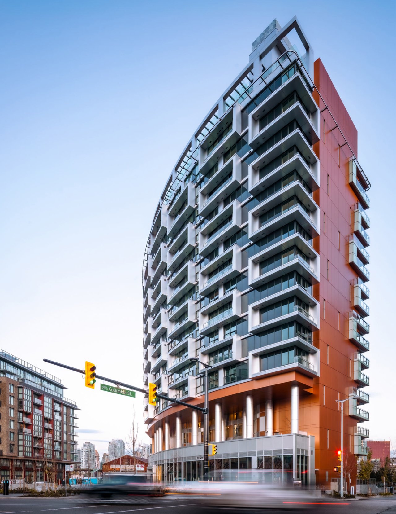 This residential development spans an entire city block just west of Olympic Village, at the prominent intersection of 2nd Avenue and Columbia Street, and comprises 247 market residential units. Departing from the linear form outlined in the masterplan, the proposed curving design embraces the adjacent open space, enhancing waterfront views for residents. A large opening punctuates the arched façade, creating pedestrian and visual connections to the waterfront via Cook Street. The building’s elevation treatment responds to its orientation: the southwest façade features localized balcony protrusions and punched windows to minimize sun exposure, while the fully glazed northern façade offers unobstructed views of False Creek.