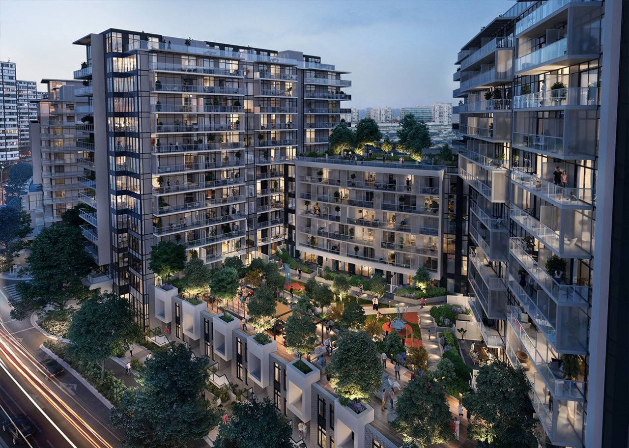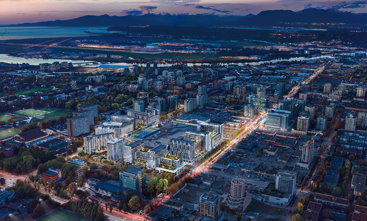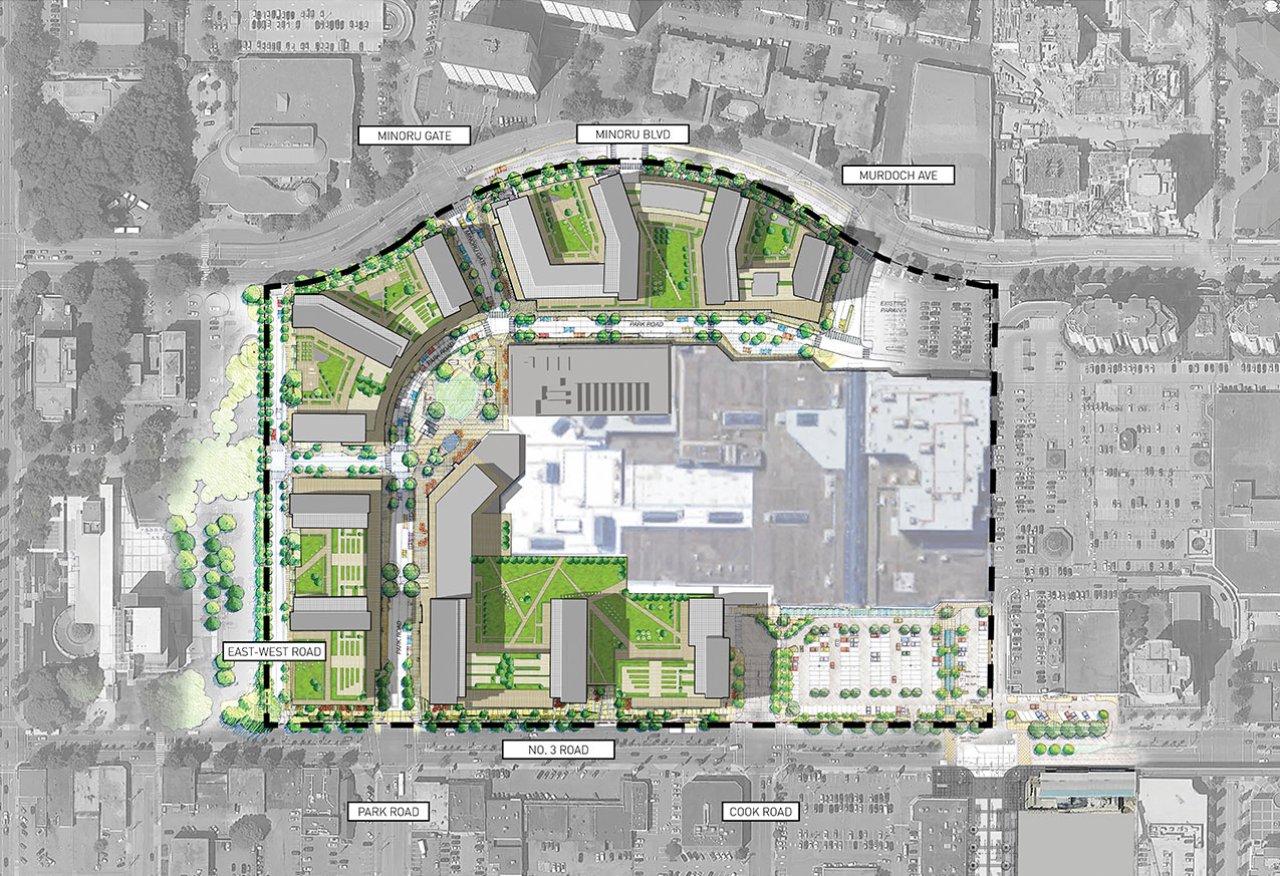 CF Richmond Centre is a complete transformation of an existing shopping mall into a master planned community of 13 towers, new commercial high streets, mobility hubs, and a public plaza all next door to a Sky Train station. The project was carefully designed to be constructed in two separate phases. Phase 1 includes seven towers, the public plaza, and four new public streets. The site orientation, new streets, and commercial significance of the site required a new approach to the City of Richmond's City Centre Design Guidelines. The development stands in stark contract to the typical high-density Richmond form of development, with varying tower and street wall heights throughout the site to create an animated backdrop to the new commercial frontages. The elongated, slender tower forms fan around the site to enhance separation, daylight, and allow an uninterrupted commercial high street to tie the new development into the existing shopping mall.