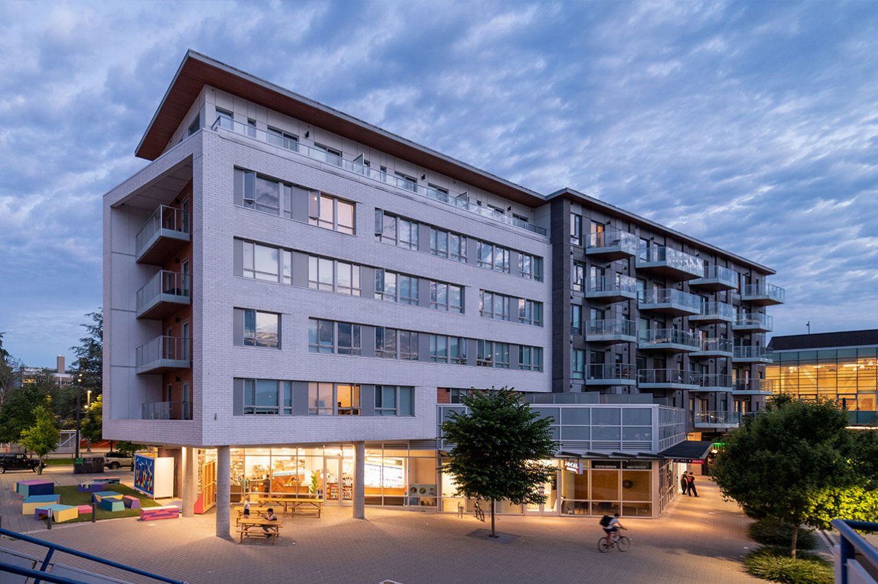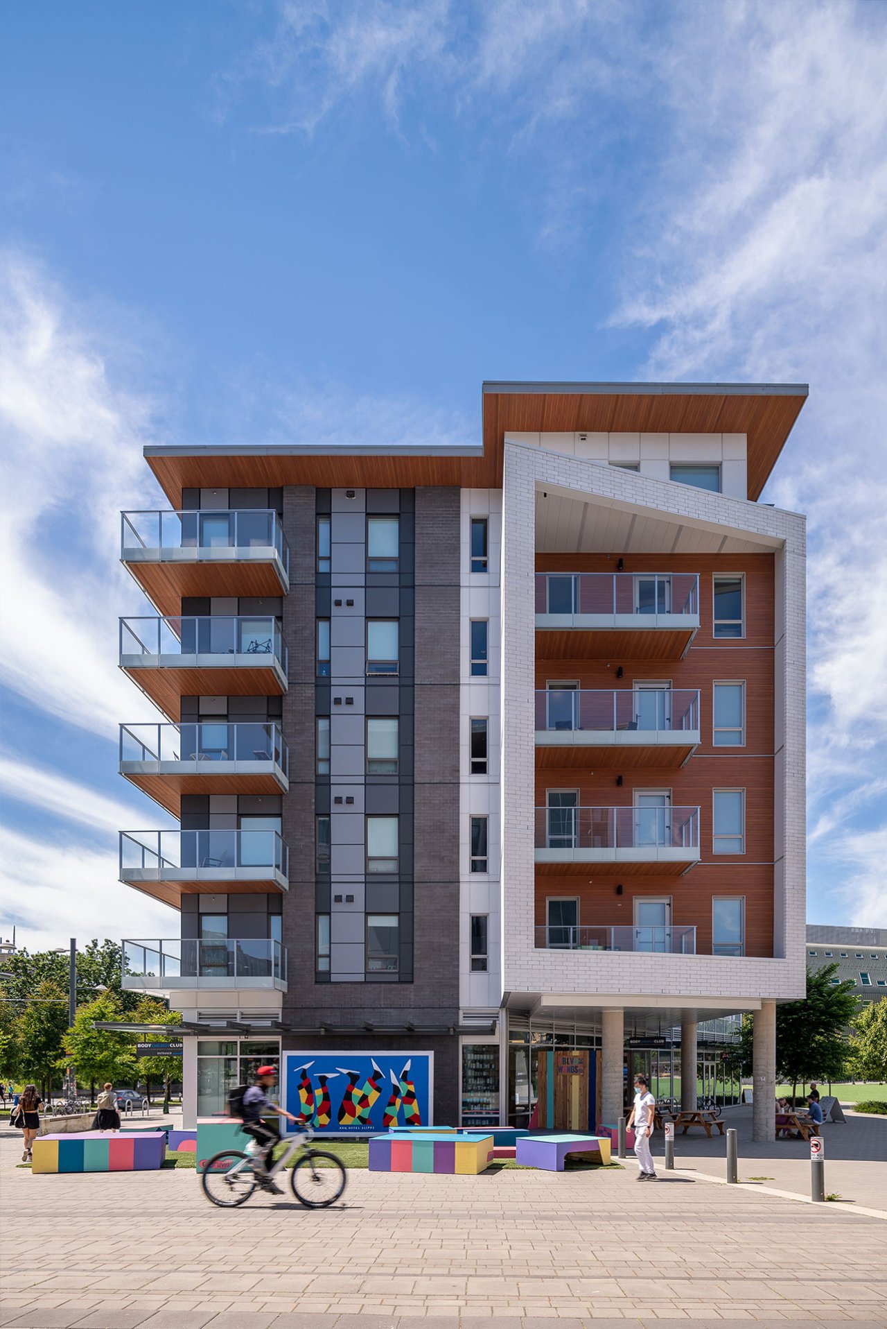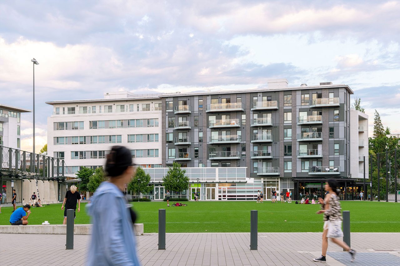 The west termination of University Boulevard has experienced significant redevelopment over recent years, including the new Alumni Centre and AMS Student Nest building. In addition to these institutional developments, a number of residential buildings have been built to help bolster the housing stock for UBC students and staff. Focal is a low-rise rental building providing a diverse mix of residential units above a retail base. The main building form aligns two interlocking rectilinear ‘tubes’ oriented along University Boulevard, whereas the retail base is shaped by the connecting pedestrian pathways that interface in and around the site. The building fronts onto MacInnes Field which was rebuilt over a single level of below grade parking as part of the Focal development, providing a valuable new recreational space for sports and outdoor events.