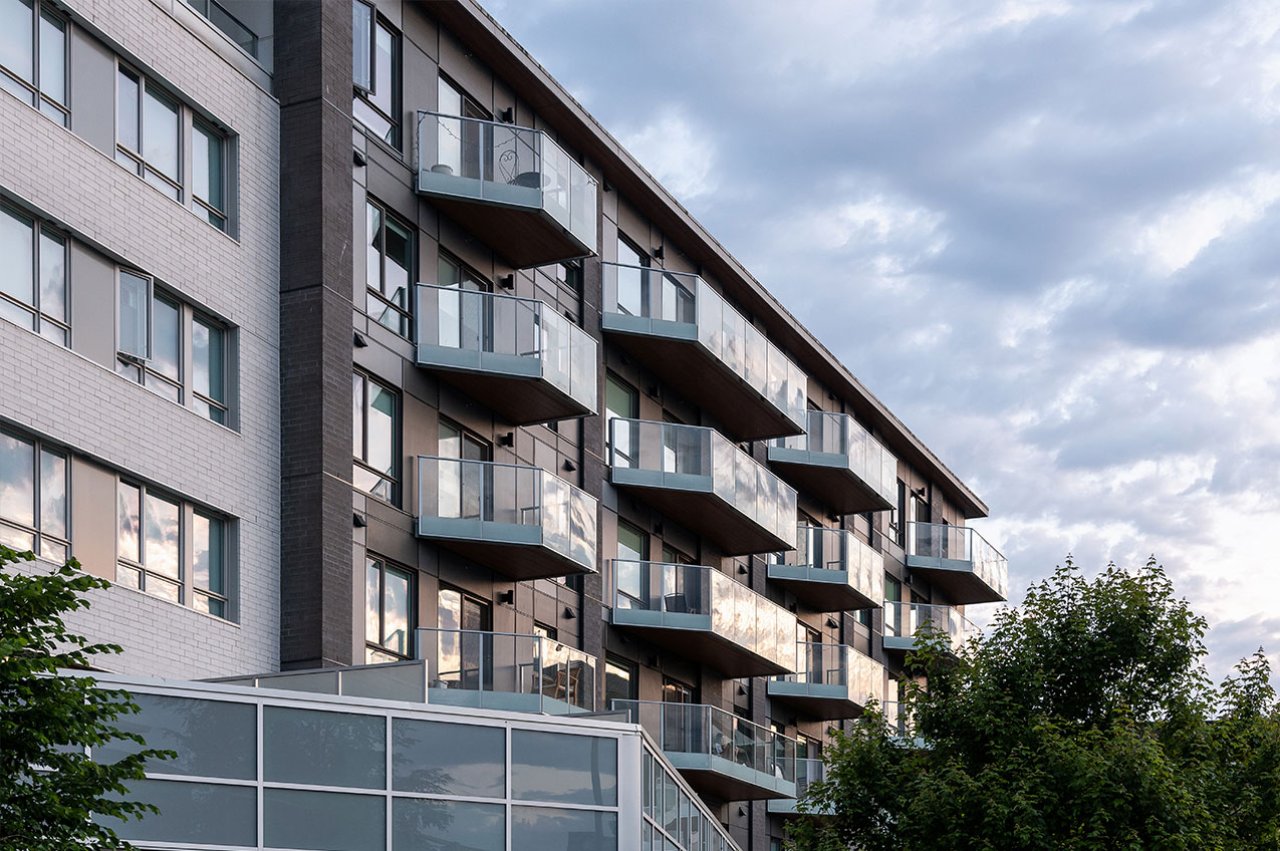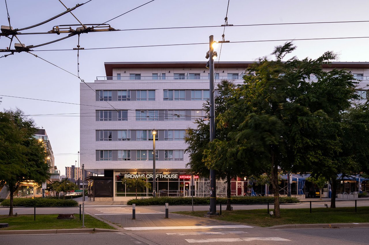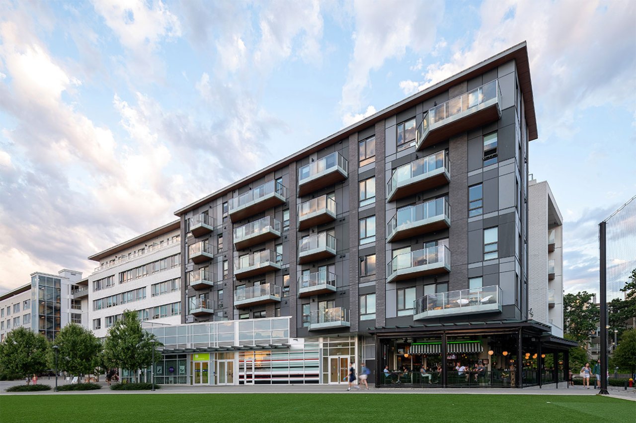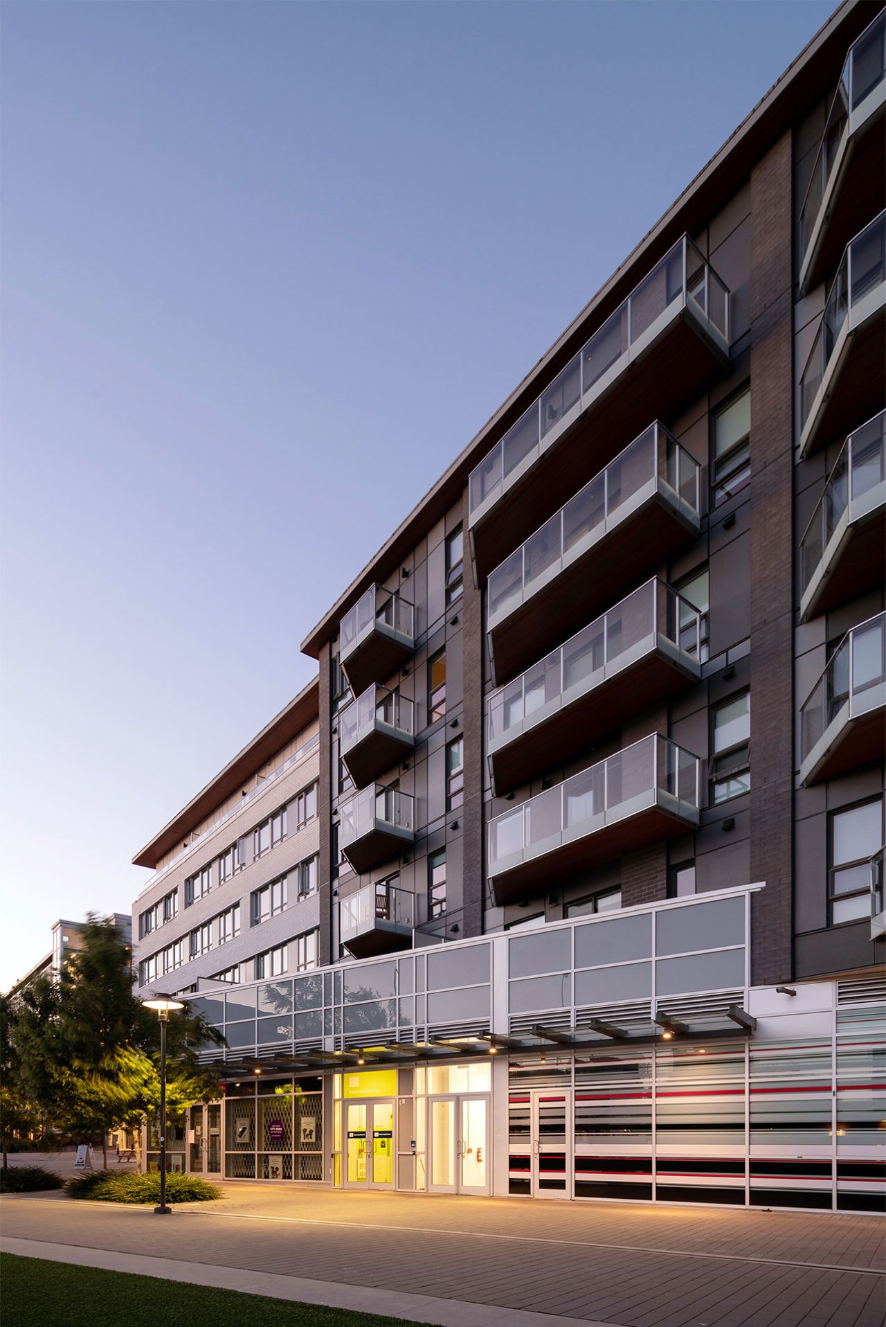 The west termination of University Boulevard has experienced significant redevelopment over recent years, including the new Alumni Centre and AMS Student Nest building. In addition to these institutional developments, a number of residential buildings have been built to help bolster the housing stock for UBC students and staff. Focal is a low-rise rental building providing a diverse mix of residential units above a retail base. The main building form aligns two interlocking rectilinear ‘tubes’ oriented along University Boulevard, whereas the retail base is shaped by the connecting pedestrian pathways that interface in and around the site. The building fronts onto MacInnes Field which was rebuilt over a single level of below grade parking as part of the Focal development, providing a valuable new recreational space for sports and outdoor events.