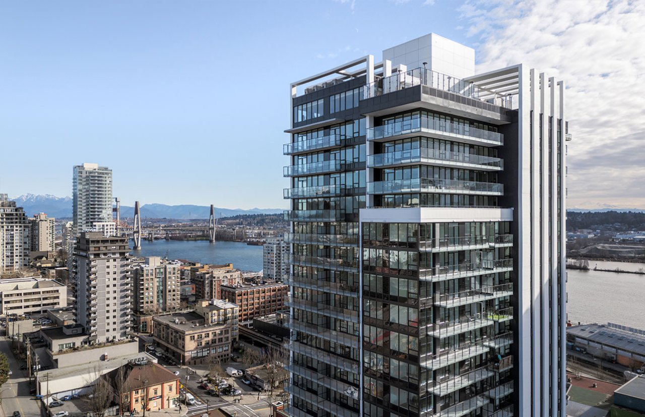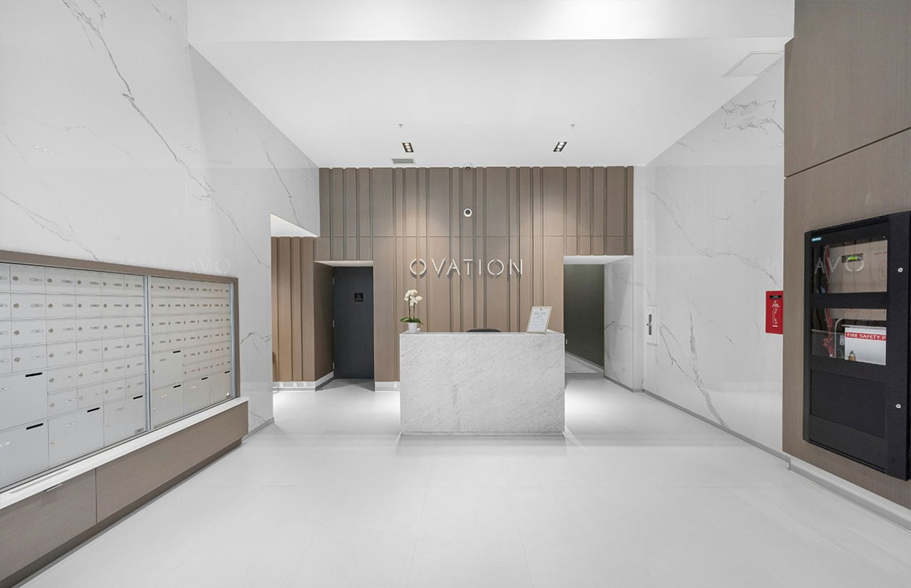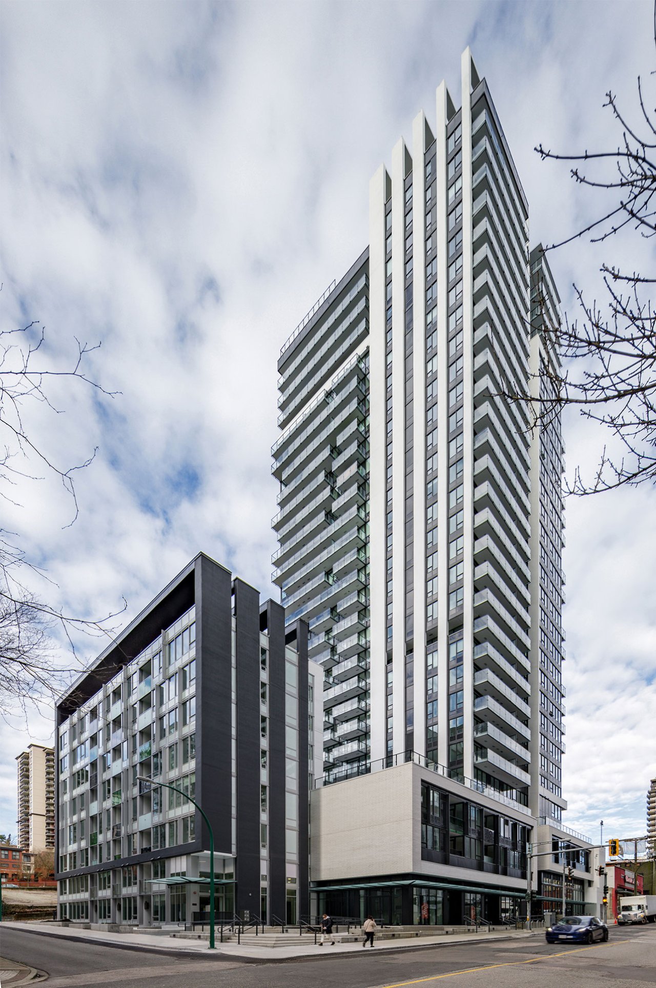 New Westminster is the oldest municipality in British Columbia, but until very recently has experienced relatively modest densification within the downtown core in comparison to other parts of the Lower Mainland. Ovation is a mixed-use residential development that has dramatically repurposed an underutilised site within the city centre, combining a diversity of residential uses while maintaining a consistent commercial edge along Carnarvon Street. The massing is defined by two residential forms above a low-profile podium, anchored to a steeply sloping corner site. The larger strata tower is characterised by vertical striations that are asymmetrically mirrored on either side, reinforcing a sense of verticality within the façade, while also providing a physical enclosure around the rooftop amenity space. The striated articulation is extended to the lower non-market building, inverting the colour palette to provide a clear sense of identity within the development. The podium base is clad in white brick, providing a more tactile element that harmonises with the existing historical buildings along Carnarvon Street.