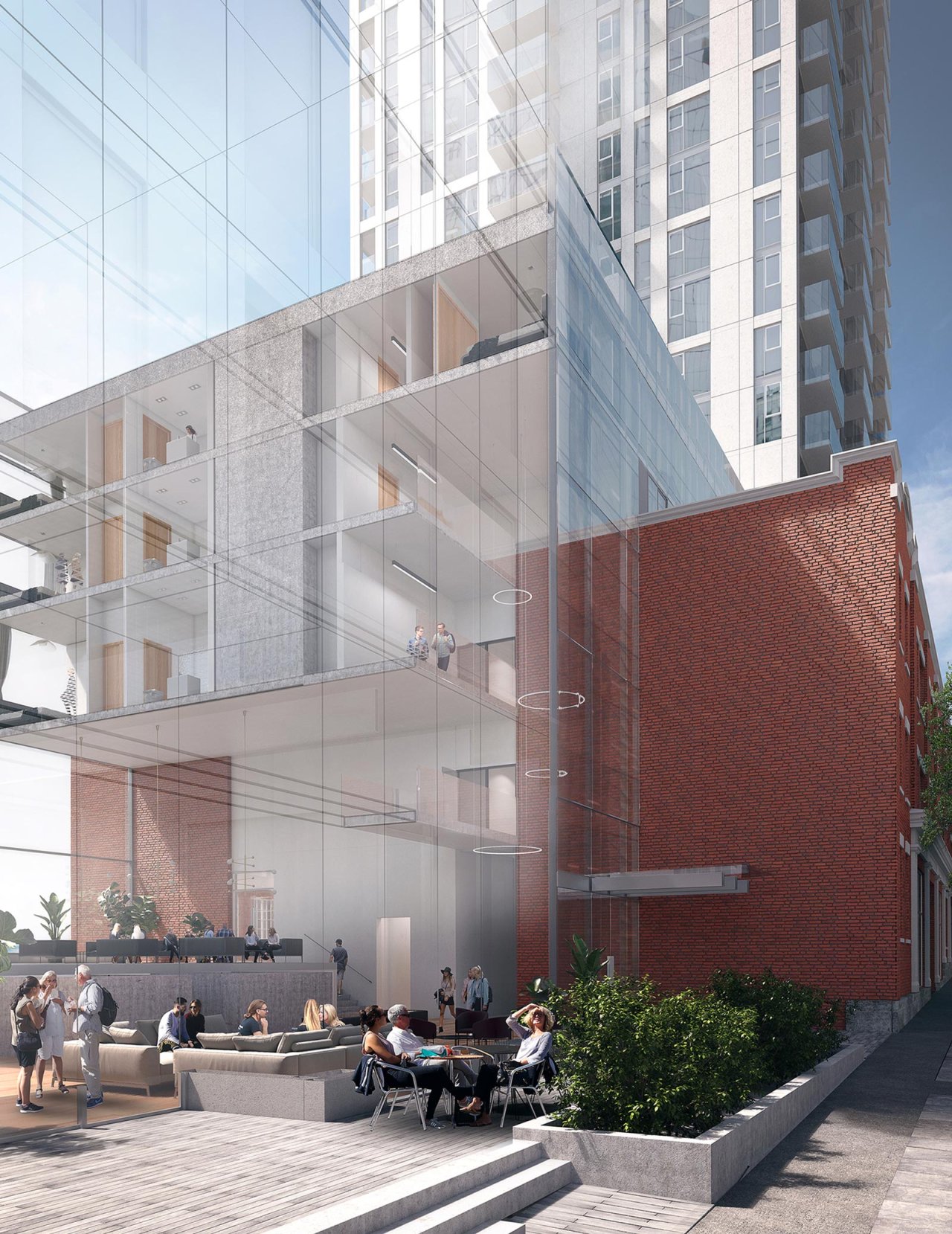 This mixed-use development involves the rehabilitation and façade retention of the historic Northern Electric building, constructed in 1928. Through a Heritage Revitalization Agreement, the project achieves a density of 10.07 FSR. The development includes a 29-storey residential tower with 177 units, 5-6 levels of hotel space, and ground-floor retail and entertainment. The residential tower, featuring a simple and uniform profile, is set on a glazed podium that visually separates it from the heritage building below. At the corner of Robson and Beatty, the new 6-storey hotel building has a monolithic architectural expression, designed to complement the form and character of Beatty Street’s existing structures while transitioning to taller buildings north of Robson Street.
