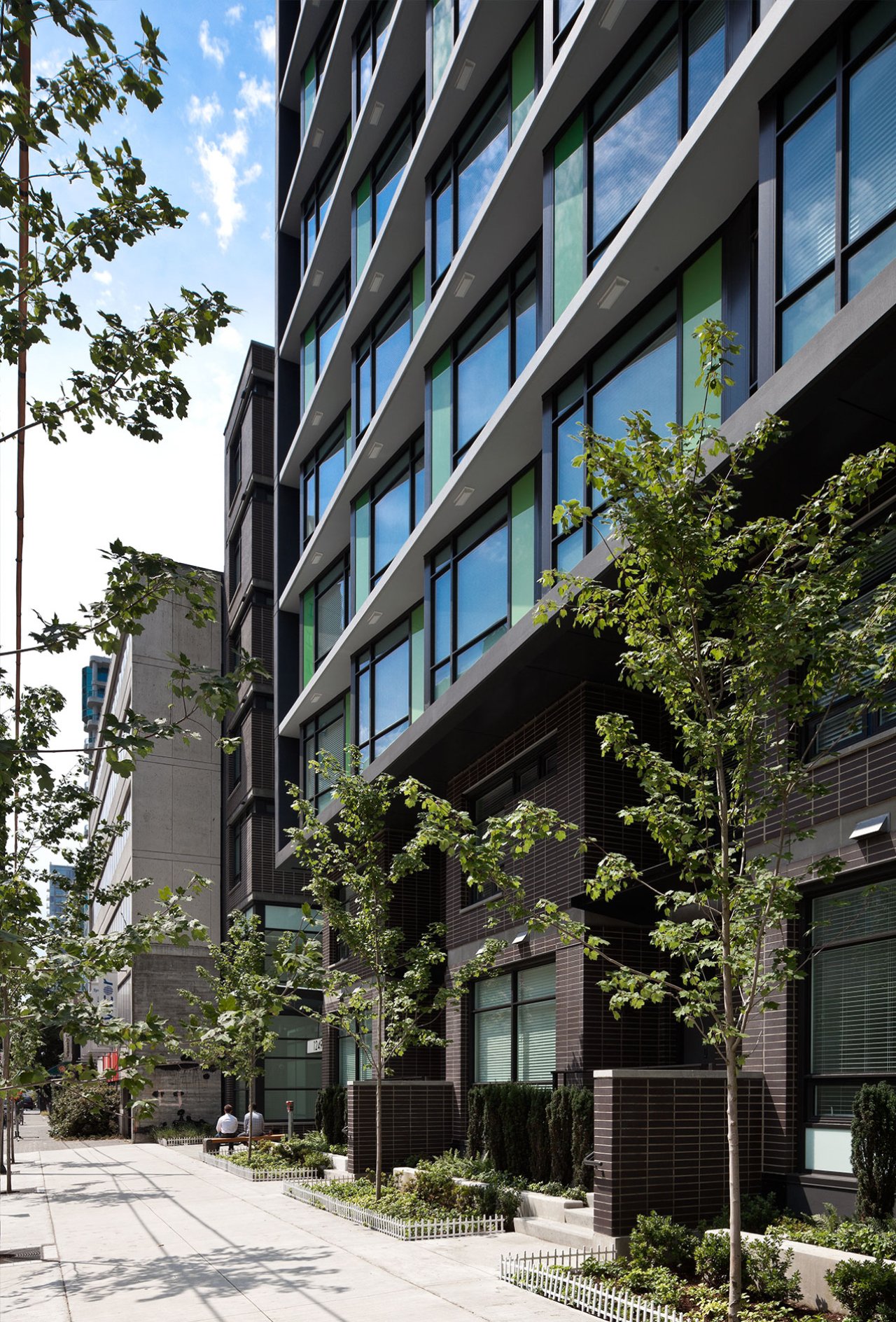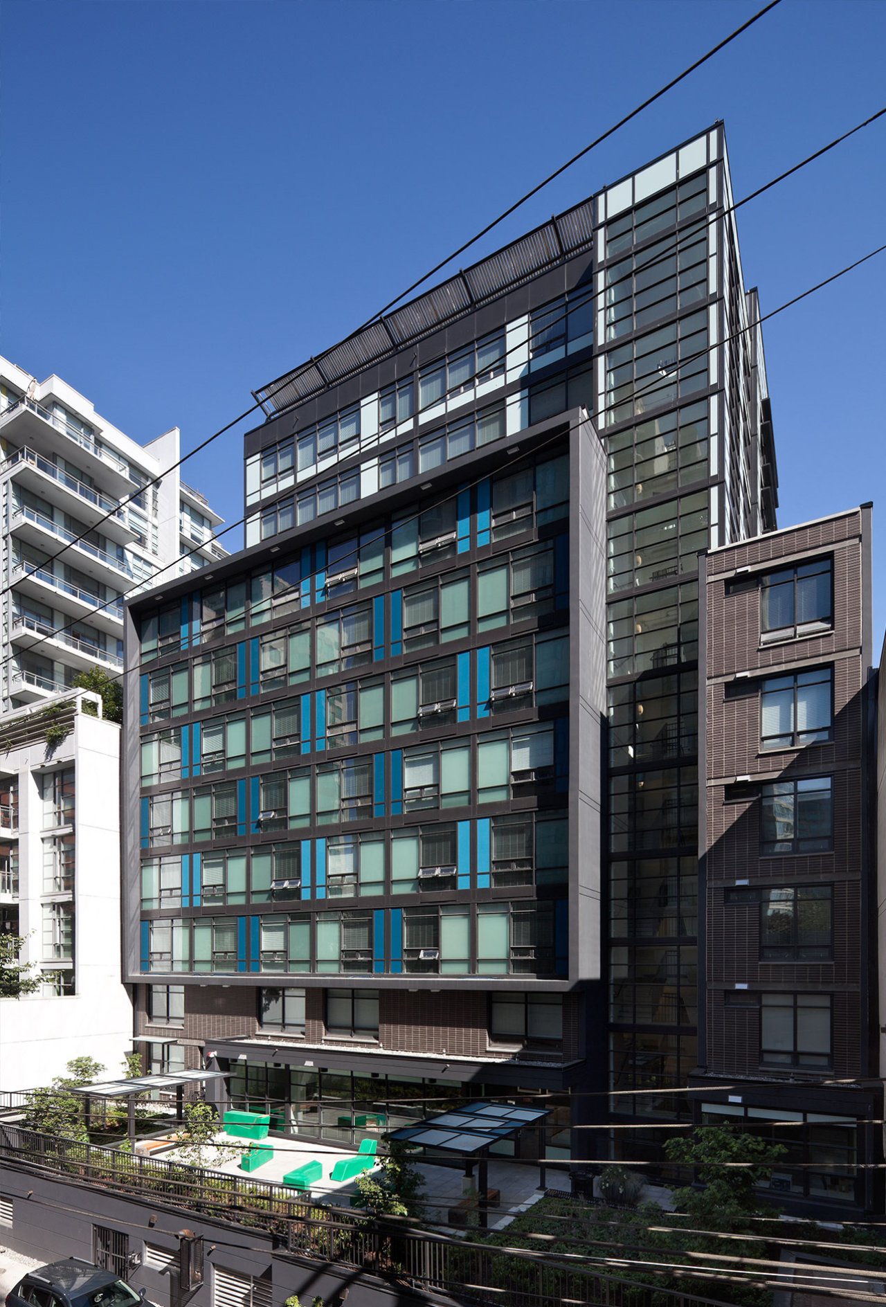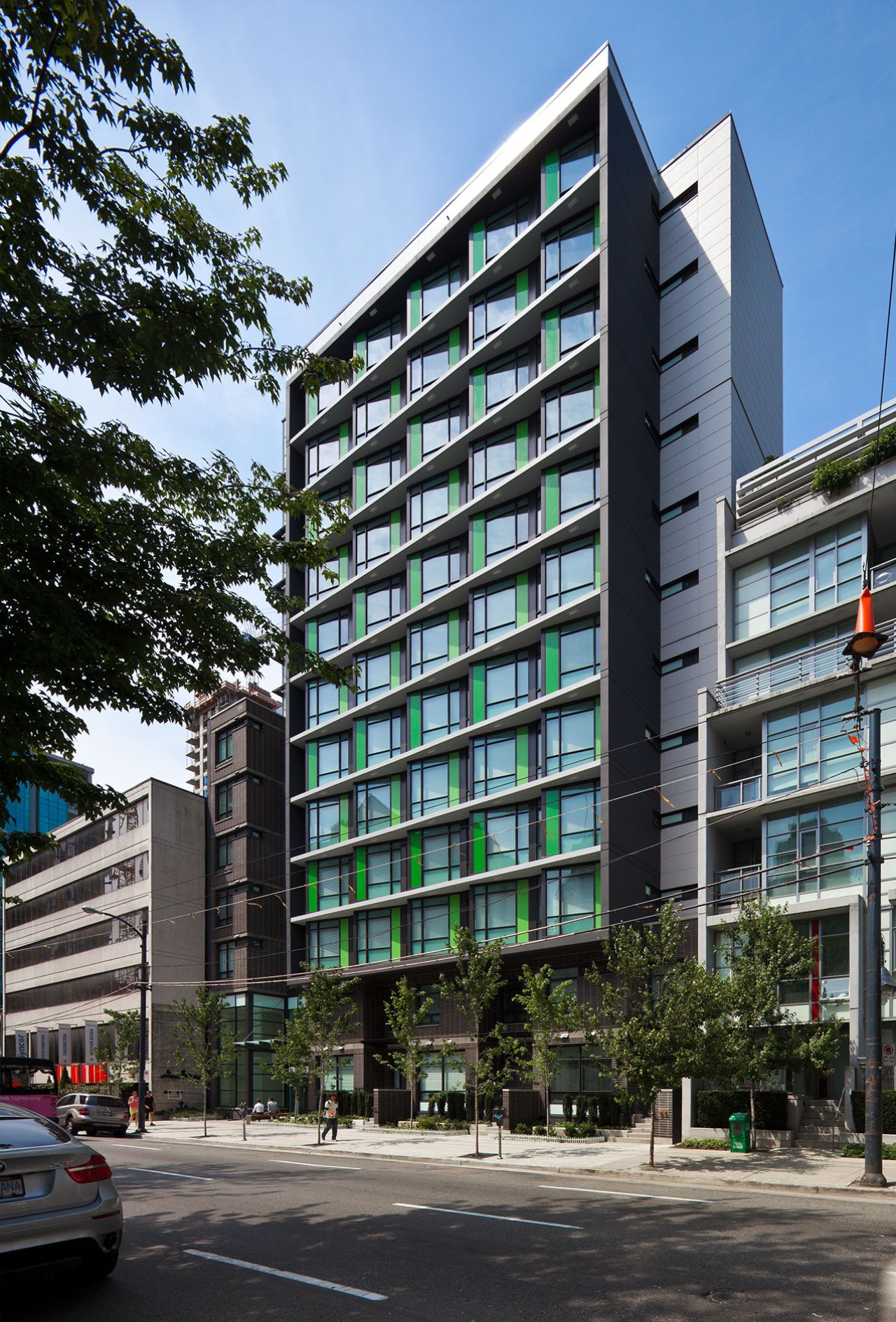 McLaren House provides 110 units of supportive housing for individuals with HIV/AIDS who are homeless or at risk of homelessness. The project was developed in partnership with the Province and the City of Vancouver as part of a wider initiative to end homelessness by providing safe and affordable housing and support services. The building is certified LEED Gold, integrating a combination of passive and mechanical design features including a solar thermal array for space heating and domestic hot water, and a green roof to help reduce the heat island effect. The residents benefit from a diversity of amenity spaces within the building, including skills-development facilities, communal lounges, patios, and a rooftop garden. Each unit was carefully designed to provide a high level of liveability within an efficient floor layout, creating safe and comfortable environments for independent living.