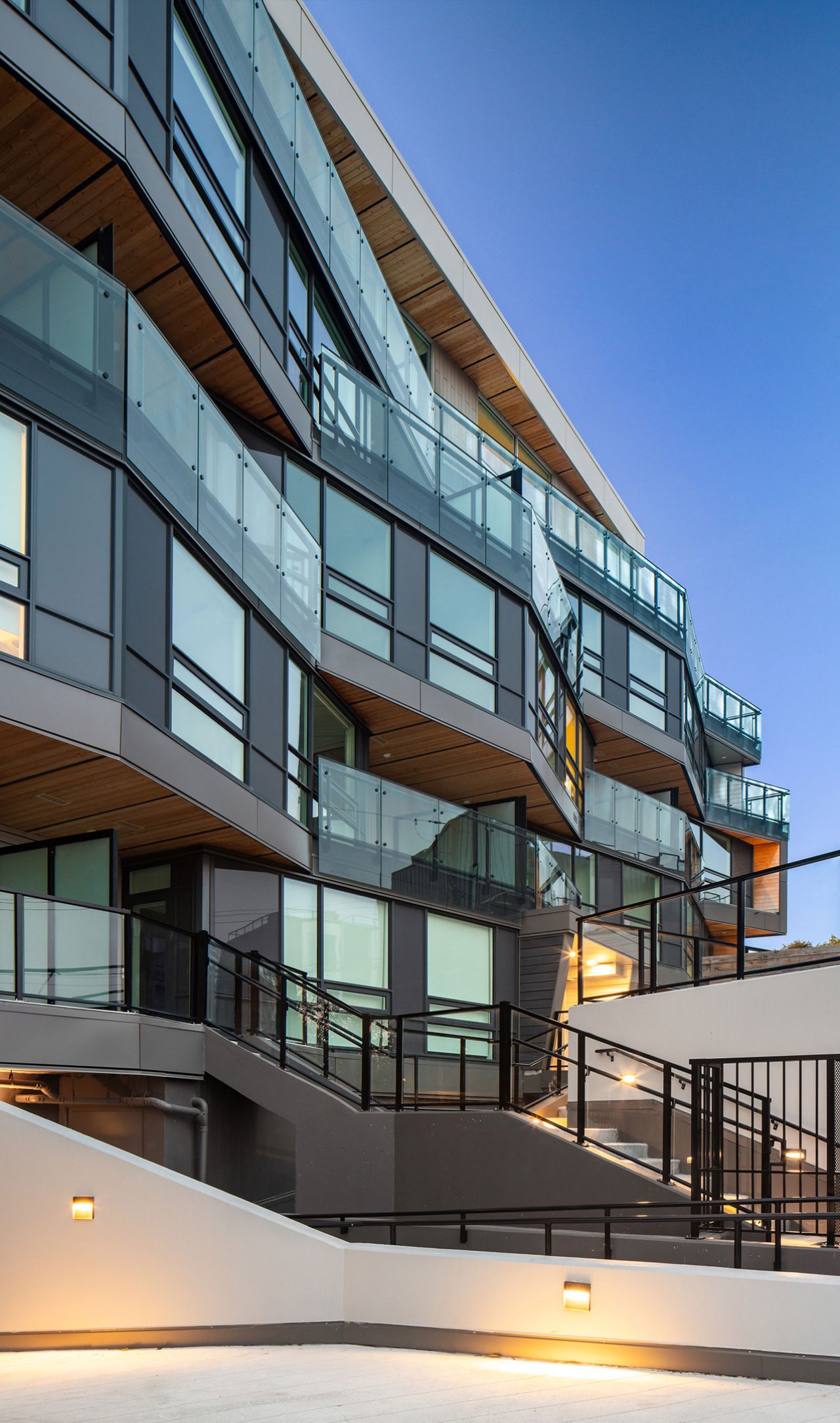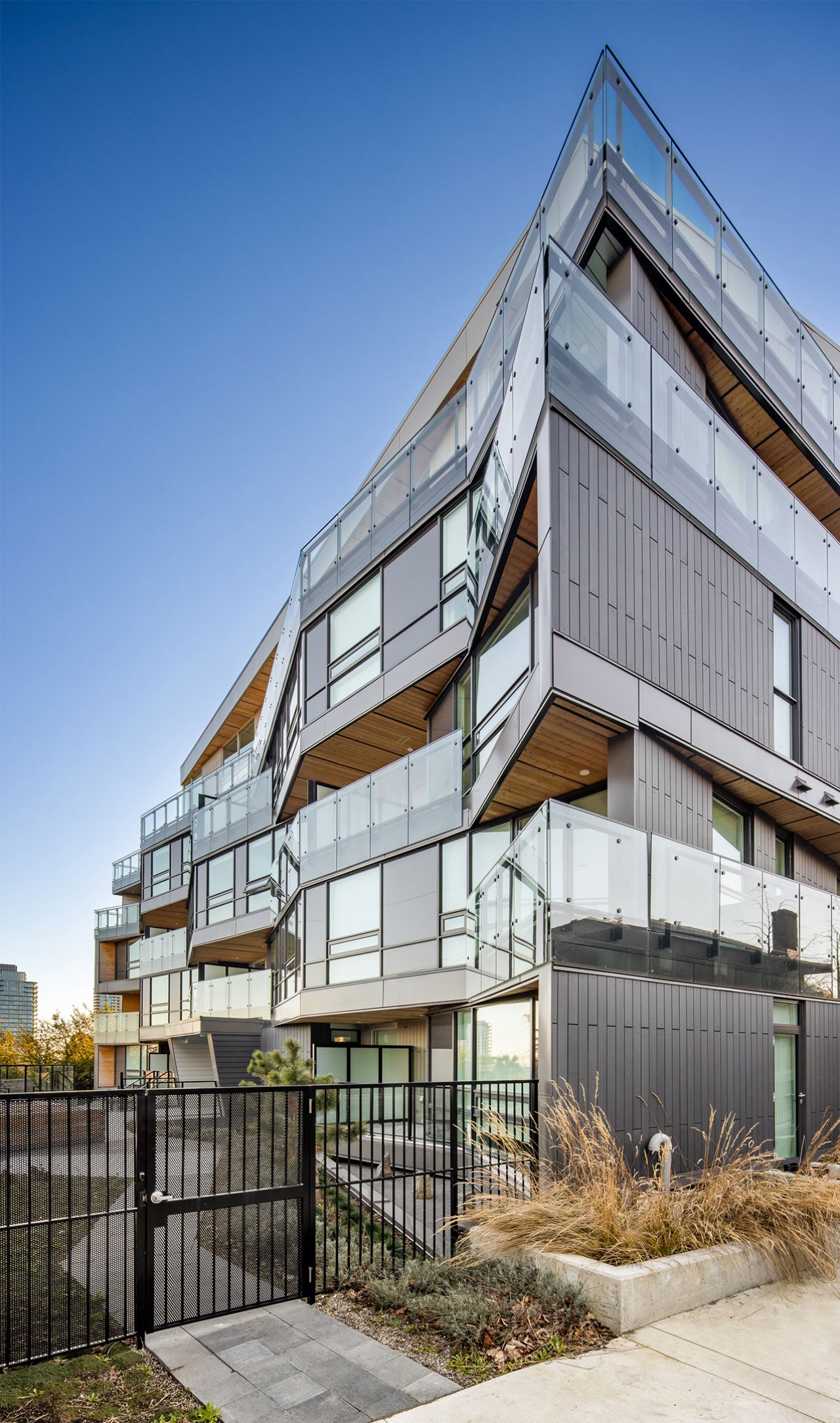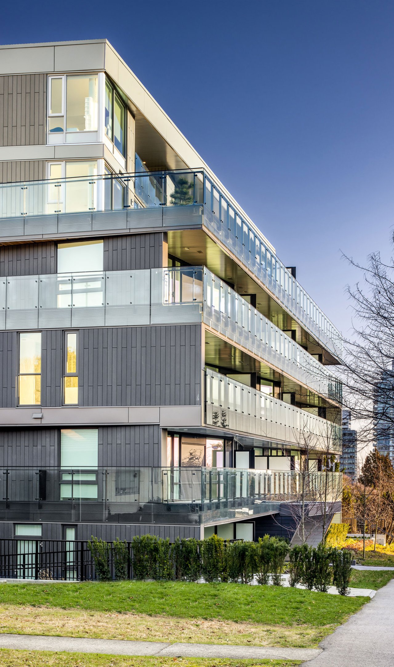 Winona is a compact multi-family residential building with highly articulated façade treatments. The street adjacency and solar orientation of the site give rise to the distinct massing; three contrasting elevation treatments visibly respond to each of their unique contextual influences. The Cambie Street façade is characterised by long linear balconies that screen the building from the afternoon sun, while also providing acoustic buffering from the busy traffic. The lane façade is inversely proportional, utilising smaller interlocking balconies providing more enclosure on the cooler side of the building. The north and south facades comprise of punched vertical glazing to miminise overlook and visually bookend the building. The complexity of the interwoven building façade is balanced by the simplicity of the symmetrical floor plan layouts. The geometry of the stepped upper levels reflects the angular treatment of the typical levels to provide a carved massing that departs from the conventions of orthogonal building tiers along the Cambie Corridor.