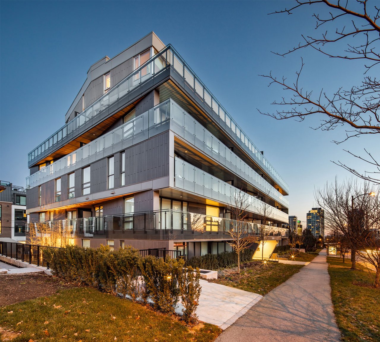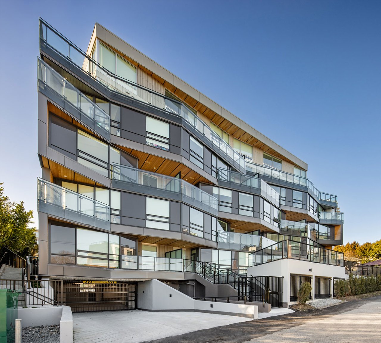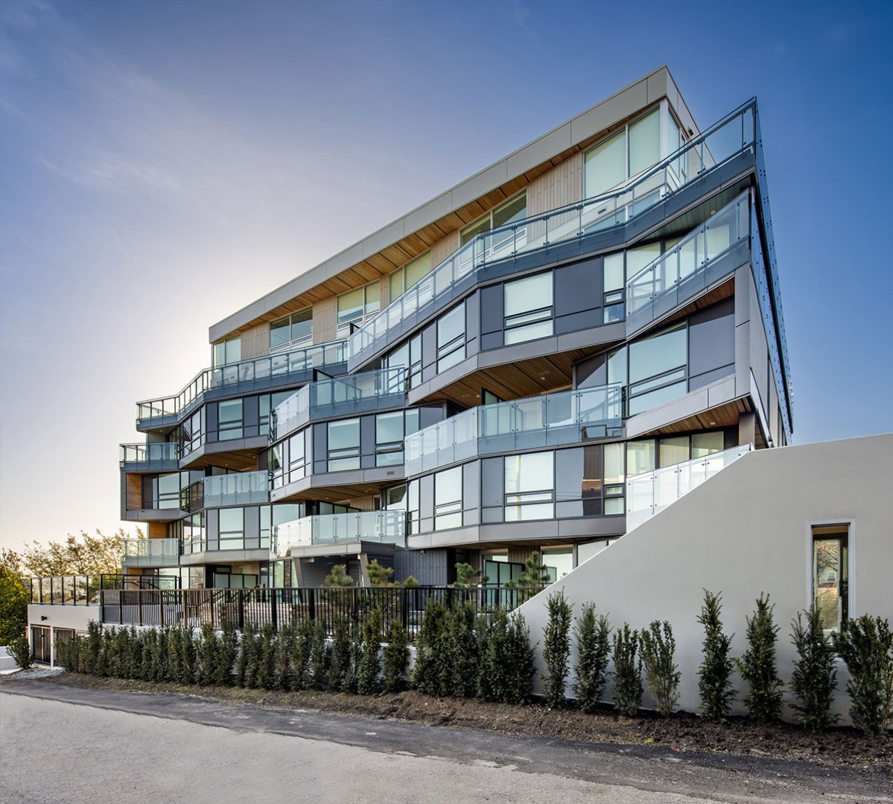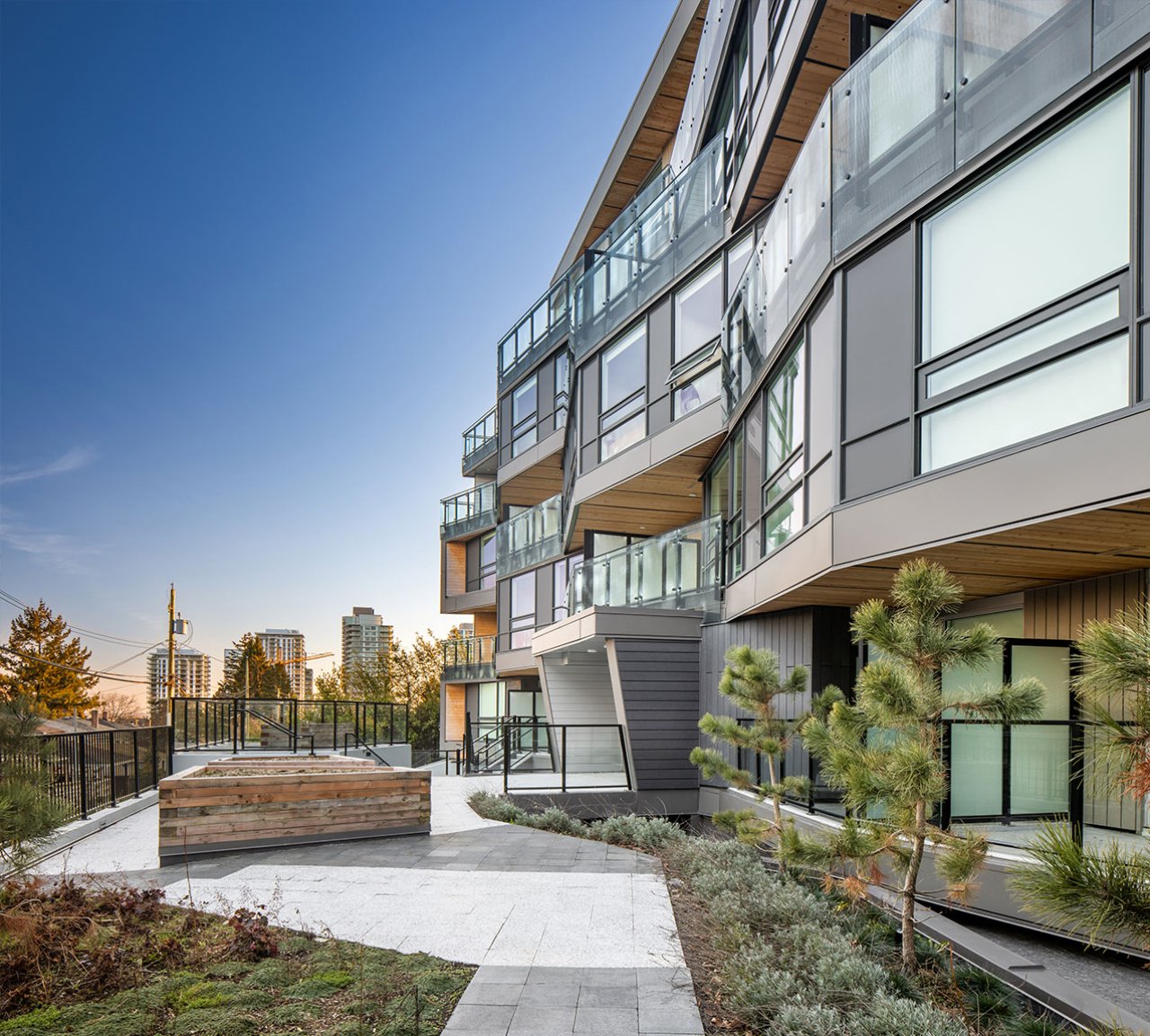 Winona is a compact multi-family residential building with highly articulated façade treatments. The street adjacency and solar orientation of the site give rise to the distinct massing; three contrasting elevation treatments visibly respond to each of their unique contextual influences. The Cambie Street façade is characterised by long linear balconies that screen the building from the afternoon sun, while also providing acoustic buffering from the busy traffic. The lane façade is inversely proportional, utilising smaller interlocking balconies providing more enclosure on the cooler side of the building. The north and south facades comprise of punched vertical glazing to miminise overlook and visually bookend the building. The complexity of the interwoven building façade is balanced by the simplicity of the symmetrical floor plan layouts. The geometry of the stepped upper levels reflects the angular treatment of the typical levels to provide a carved massing that departs from the conventions of orthogonal building tiers along the Cambie Corridor.